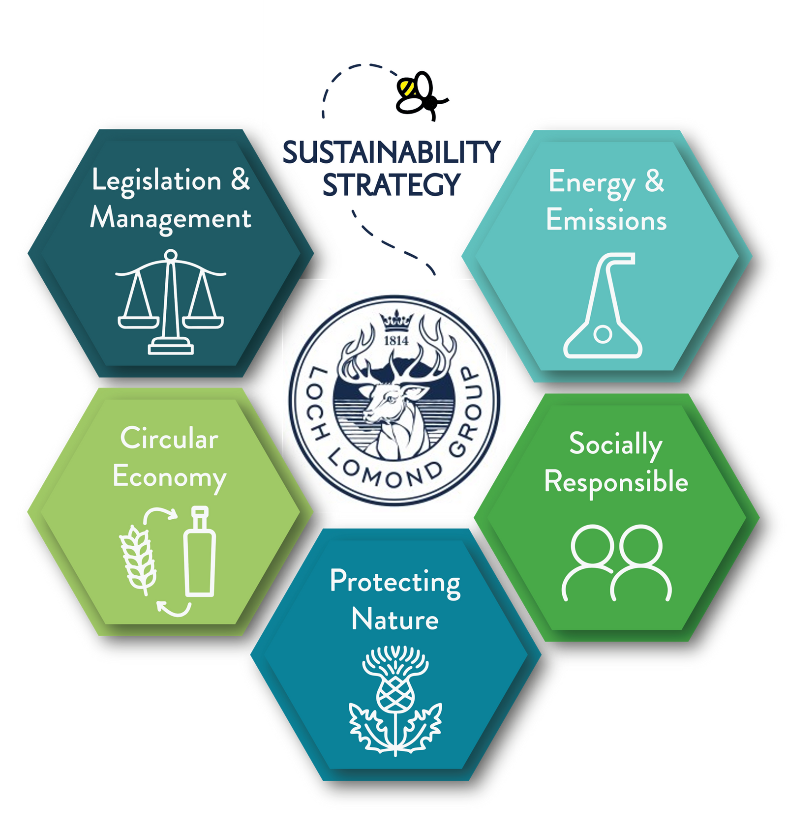 The framework anchors 5 key drivers that are designed to deliver the targets that make Loch Lomond Group a more responsible and sustainable business; legislation & management, energy & emissions, circular economy, protecting nature and socially responsible.